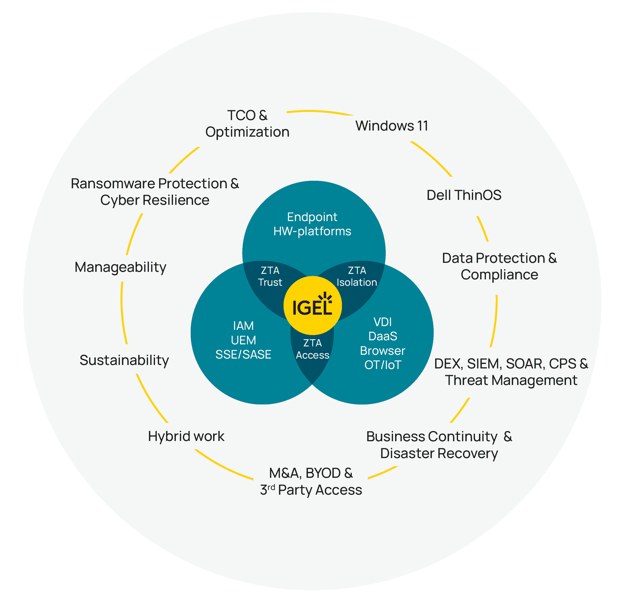 IGEL’s role-based, context-aware workspace delivery model adapts to meet the needs of every user, while enforcing the principles of failsafe security with the Preventative Security Model, orchestrated from a single platform with the Universal Management Suite.
